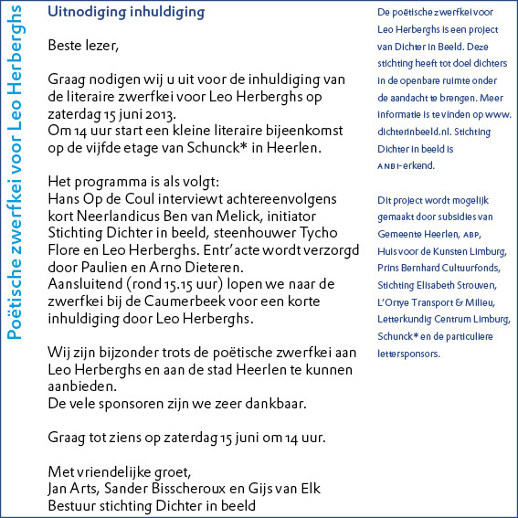 De poëtische zwerfkei voor dichter Leo Herberghs is een project van Dichter in Beeld. Deze stichting heeft tot doel dichters in de openbare ruimte onder de aandacht te brengen. Meer informatie is te vinden op www.dichterinbeeld.nl. Stichting Dichter in beeld is ANBI-erkend.