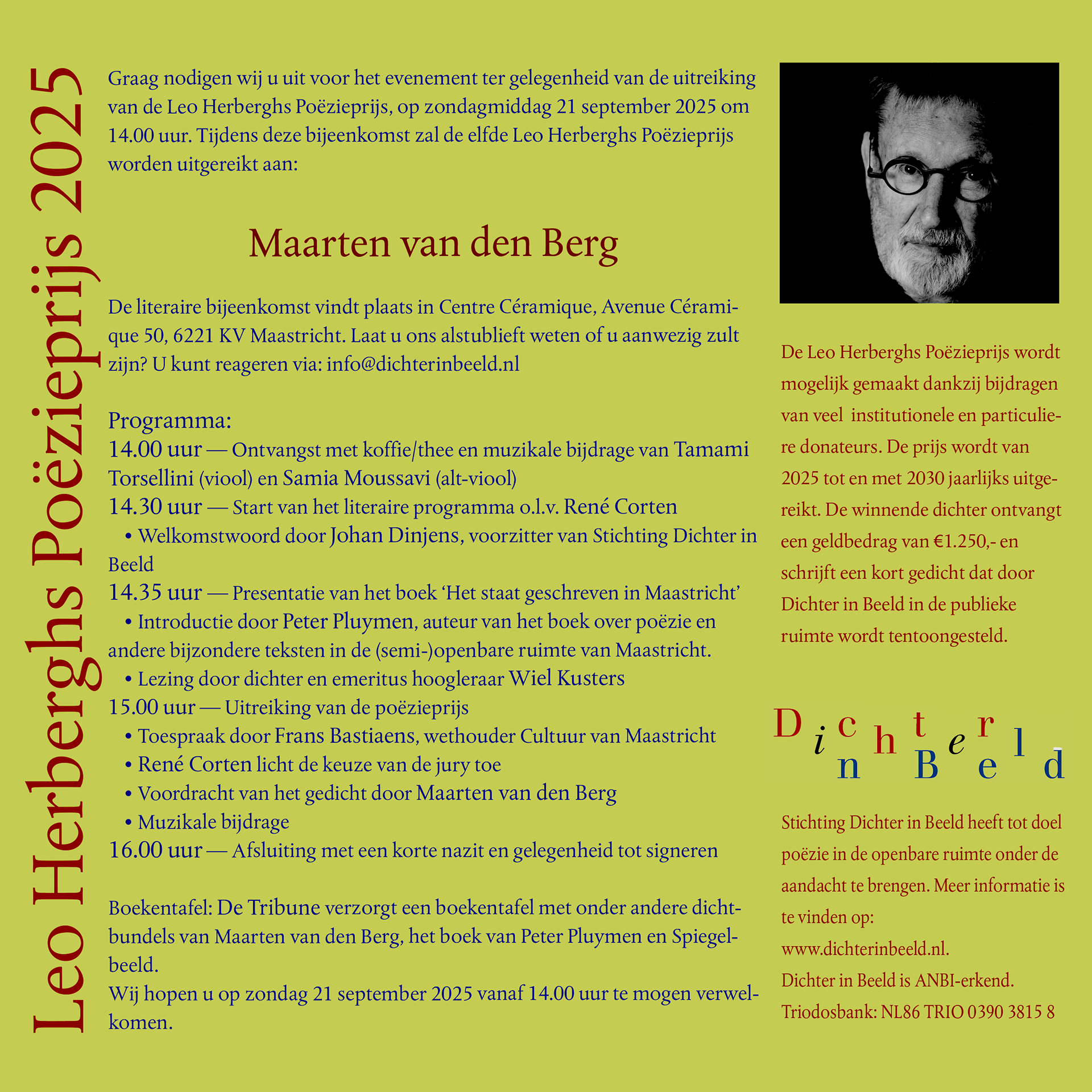 Zoals al eerder aangekondigd zal de uitreiking van de Leo Herberghs Poëzieprijs 2024 plaatsvinden op 13 oktober 2024 in het Centre Cėramique te Maastricht. Onderstaand het voorlopige programma van die middag.