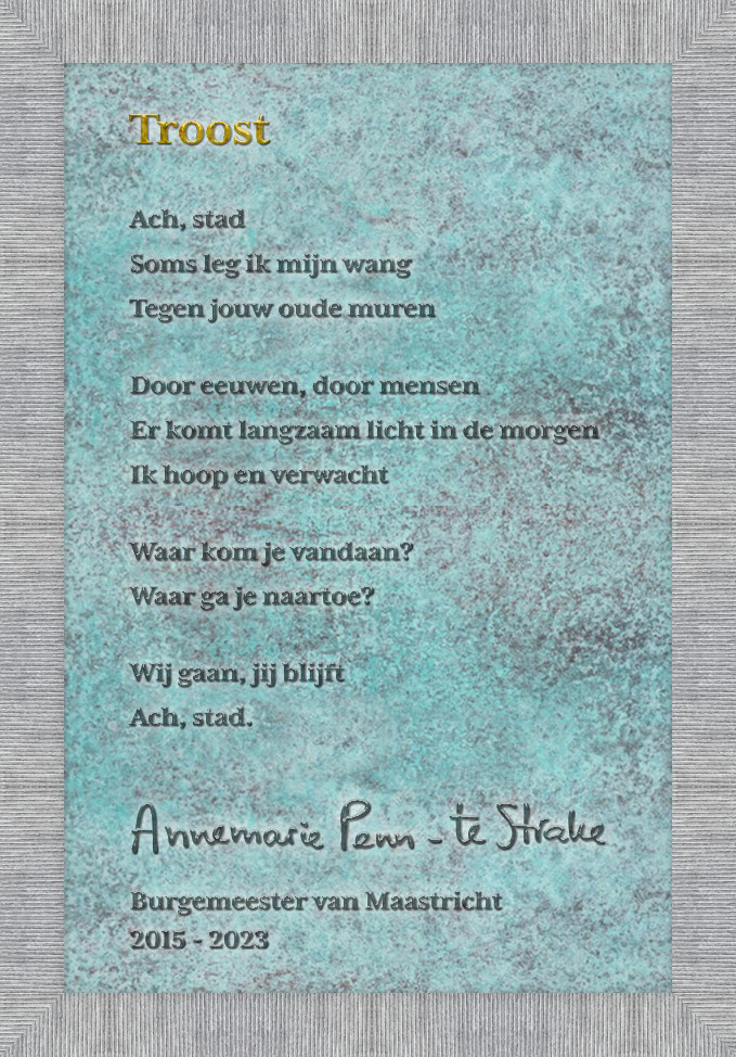 'Afgelopen weekend was ik aanwezig bij het afscheid van Annemarie Penn als burgemeester van Maastricht. Ik trof daar Désirée Tonnaer, beeldend kunstenaar, die me vertelde over het jammerlijk mislukken van een initiatief om het gedicht dat Annemarie ter afsluiting die middag voorlas, een plek te geven in de stad, m.n. tegen de zijmuur van de Poort Waerachtig.'