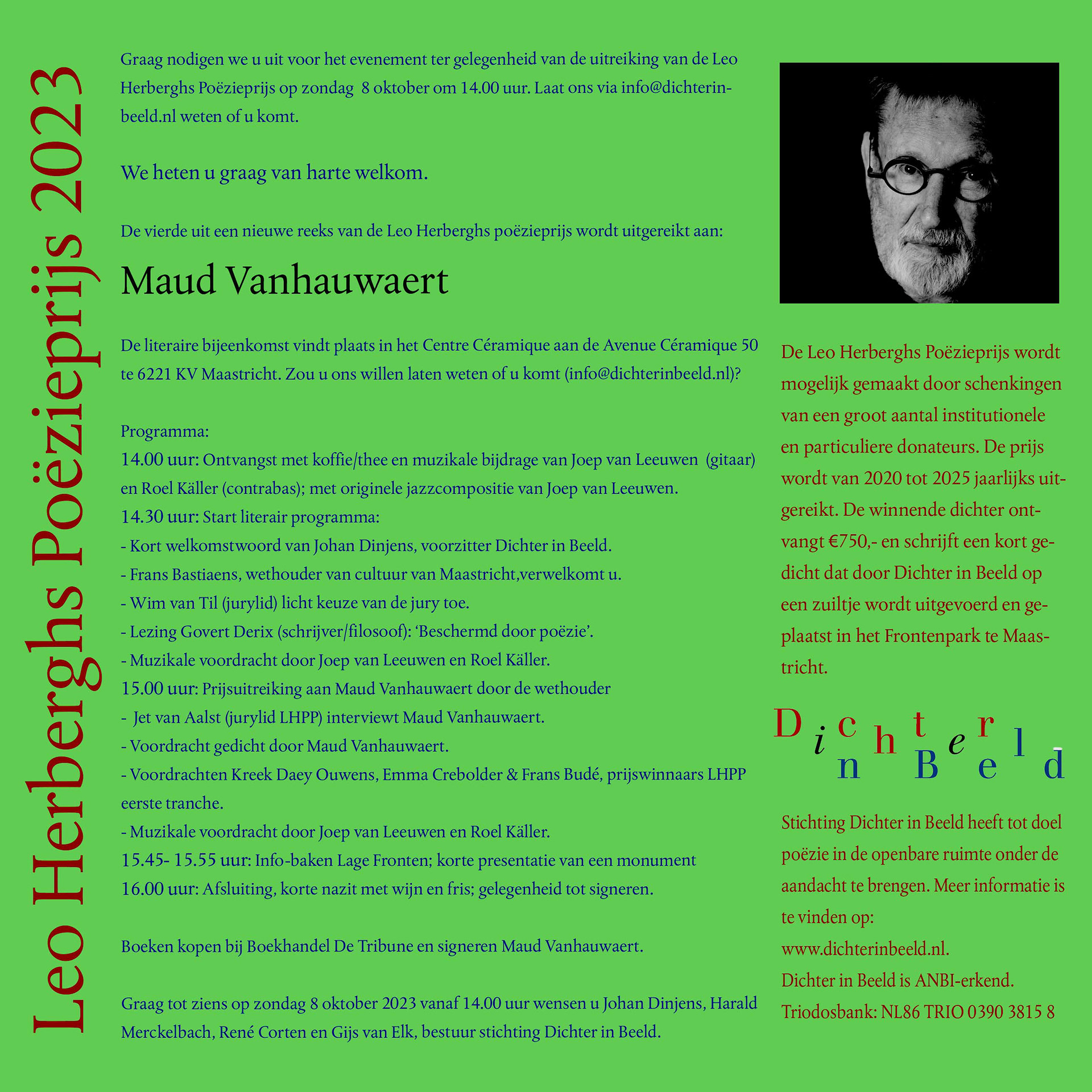 Maud Vanhauwaert is door de jury uitgeroepen tot winnaar van de Leo Herberghs Poëzieprijs 2023 (zie het juryrapport). Ze heeft intussen de prijs geaccepteerd. Dichter in Beeld is daar heel blij mee en is er van overtuigd met haar een gerenomeerd dichter aan het lijstje van geweldige prijswinnaars te kunnen toevoegen. In 2020 won Maarten van der Graaff deze prijs. Vervolgens Marieke Lucas Rijneveld in 2021 en Radna Fabias in 2022. Mogelijk heeft u het evenement ter gelegenheid van de uitreiking aan de vorige winnaars bijgewoond. Dichter in Beeld heeft deze evenementen als een succes ervaren en heeft op deze site er verslag van gedaan (klik hierboven op de naam van de prijswinnaar).
