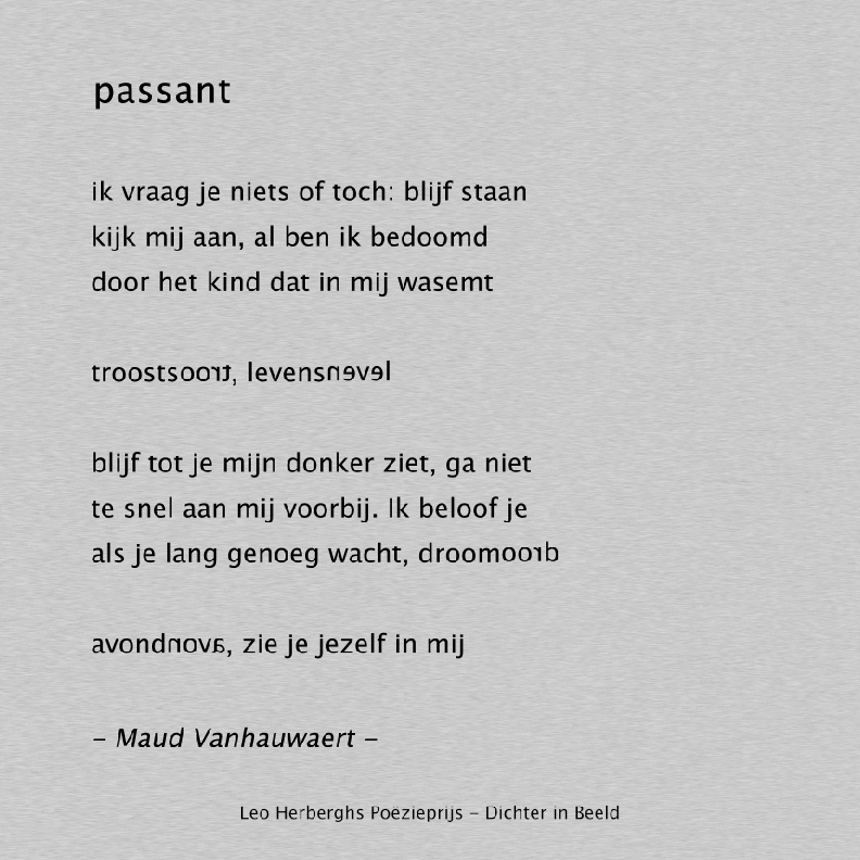 Bovenstaand gedicht schreef Maud Vanhauwaert voor de LHPP 2023. Het gedicht op een roestvrij stalen plaquette werd op een zuiltje van cortenstaal geplaatst op de route geplaatst in de Lage Fronten. Als u op het gedicht klikt wordt u naar een site van RTV-Maastricht verwezen. Het zuiltje werd bij volle maan in de grond gezet. Govert Derix hintte hierop in zijn lezing: